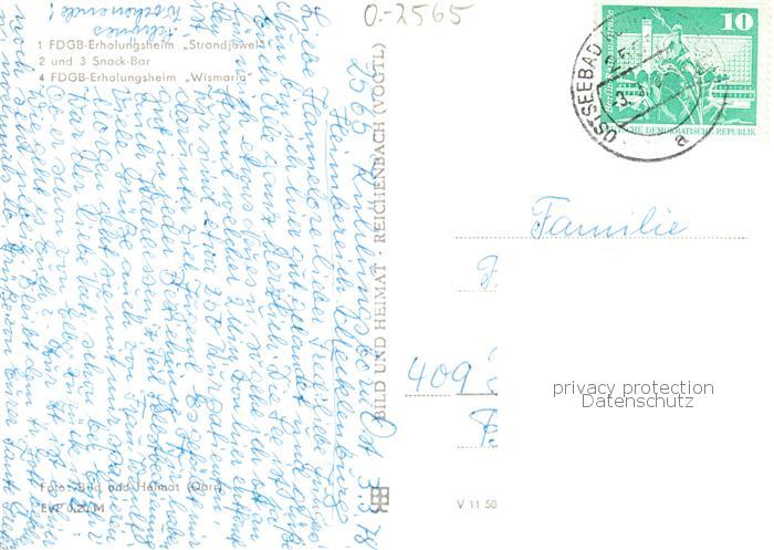 73870816 alte Postkarte Kuehlungsborn Ostseebad FDGB Erholungsheim Strandjuwel Snack Bar FDGB Erholungsheim Wismaria postalisch gelaufen Erhaltung siehe scans [WerneD78] KatCode: 11110013051042