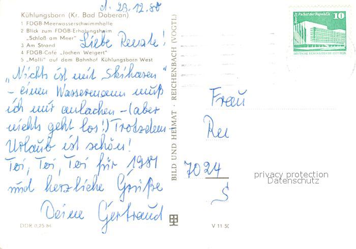 73099989 alte Postkarte Kuehlungsborn Ostseebad FDGB Meerwasserschwimmhalle FDGB Erholungsheim Schloss am Meer postalisch gelaufen Erhaltung siehe scans [KathaD81] KatCode: 11110013051042