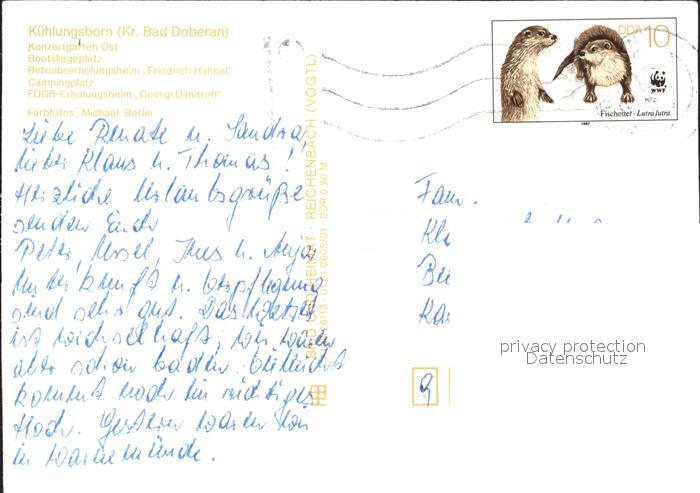 72315067 alte Postkarte Kuehlungsborn Ostseebad Konzertgarten Bootsliegeplatz Betriebsferienheim Friedrich Haehnel Camping FDGB Heim Georgi Dimitroff postalisch gelaufen Erhaltung siehe scans KatCode: 11110013051042