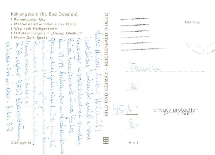 73045321 alte Postkarte Kuehlungsborn Ostseebad Konzertgarten Meerwasserschwimmhalle des FDGB Weg nach Heiligendamm FDGB Erholungsheim Georgi Dimitroff Maxim Gorki Strasse postalisch gelaufen Erhaltung siehe scans [WerneD78] KatCode: 11110013051042