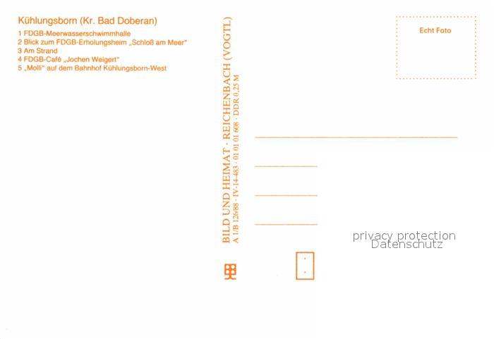 72898713 Kuehlungsborn Ostseebad Meerwasserschwimmhalle Erholungsheim Schloss am Meer Cafe Jochen Weigert Molli postalisch nicht gelaufen Erhaltung siehe scans [PaolaD17] KatCode: 11110013051042