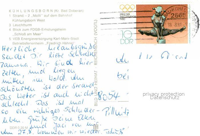 72634339 alte Postkarte Kuehlungsborn Ostseebad Strand Molli Leuchtturm Erholungsheim Schloss am Meer und Friedrich Haehnel postalisch gelaufen Erhaltung siehe scans [AndreD76] KatCode: 11110013051042