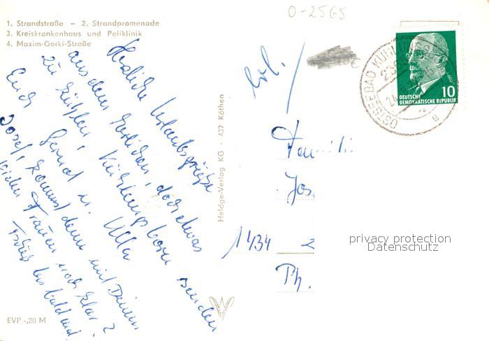 72982238 alte Postkarte Kuehlungsborn Ostseebad Strandstrasse Strandpromenade Kreiskrankenhaus Poliklinik Maxim Gorki Strasse postalisch gelaufen Erhaltung siehe scans [WerneD78] KatCode: 11110013051042
