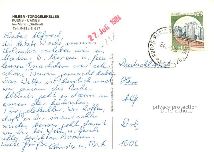 old postcard Kuens Hilber-Toerggelekeller postalisch gelaufen Erhaltung siehe scans [NatalD47]