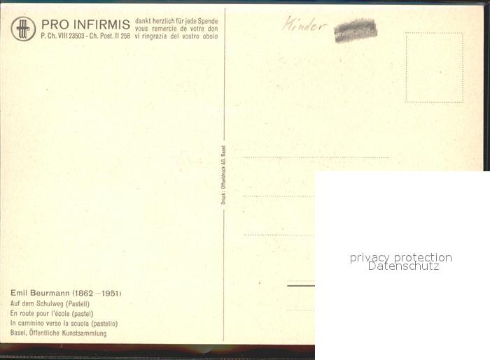 Kuenstlerkarte Emil Beurmann Auf dem Schulweg Spendenkarte Pro Infirmis Kinder Schultafel postalisch nicht gelaufen Erhaltung siehe scans