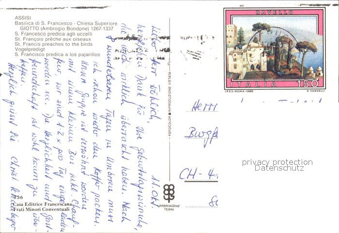 alte Postkarte Kuenstlerkarte Giotto Ambrogio Bondone S. Francesco predica agli uccelli Assisi postalisch gelaufen Erhaltung siehe scans