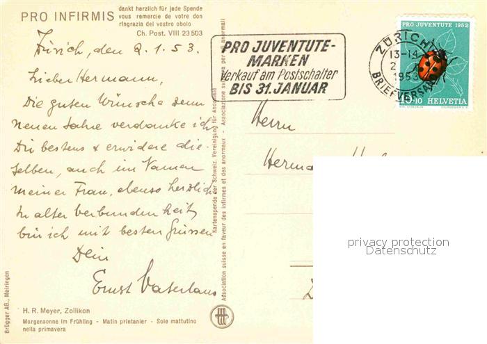 alte Postkarte Kuenstlerkarte H. R. Meyer Morgensonne im Fruehling Pro Infirmis postalisch gelaufen Erhaltung siehe scans [PaolaD17]