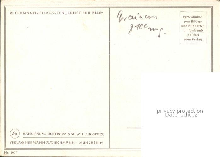 41608164 Kuenstlerkarte Untergrainau mit Zugspitze Wetterstein Kreuz Hans Saum Wiechmann Bildkarten Kunst für Alle KatCode 22240000003200