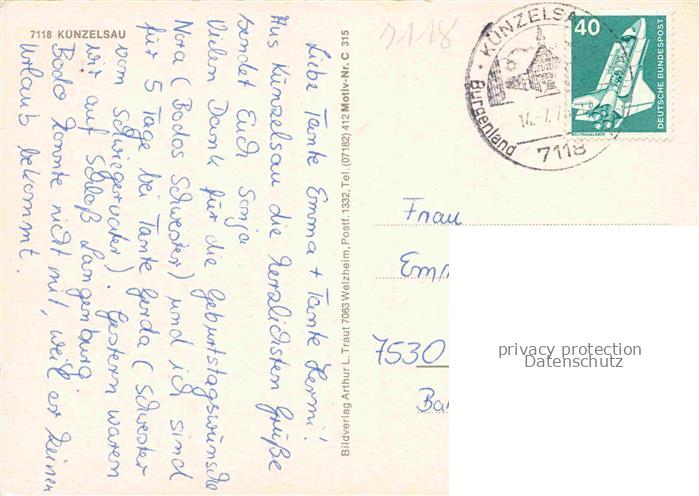 74054836 alte Postkarte Kuenzelsau Kocherbruecke Kirche Hauptstrasse Rathaus Schnurgasse Morsbacher Tor Schloss postalisch gelaufen Erhaltung siehe scans [FriedD77] KatCode: 11110008126046