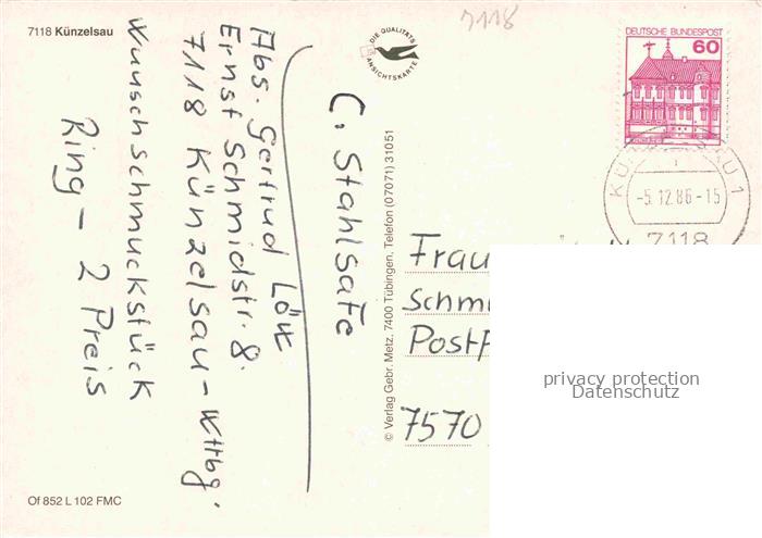 74054868 alte Postkarte Kuenzelsau Panorama Stadtzentrum Schloss postalisch gelaufen Erhaltung siehe scans [FriedD77] KatCode: 11110008126046