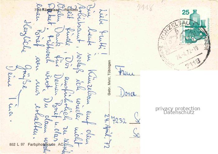 74054873 alte Postkarte Kuenzelsau Rathaus Altstadt Fachwerkbauten postalisch gelaufen Erhaltung siehe scans [FriedD77] KatCode: 11110008126046
