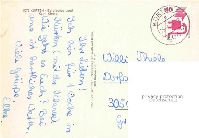 74144156 alte Postkarte Kuerten KoeLN Bergisches Land Kath. Kirche postalisch gelaufen Erhaltung siehe scans [SanaeD93] KatCode: 11110005315000
