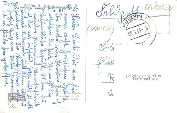 74029798 old postcard Kuestrin Cuestrin-Neustadt Ostbrandenburg Kostrzyn PL Reservelazarett postalisch gelaufen Feldpost – Stempel Erhaltung siehe scans [WerneD78] KatCode: 11410