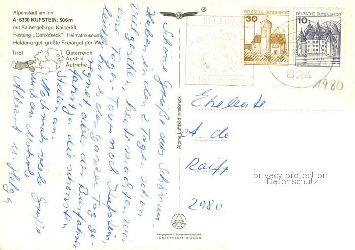 73204069 alte Postkarte Kufstein Tirol Fliegeraufnahme Kaisergebirge Festung Geroldseck postalisch gelaufen Erhaltung siehe scans [NatalD47] KatCode: 11390335070513