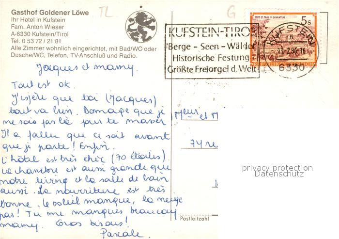 73588076 alte Postkarte Kufstein Tirol Gasthof Goldener L?we postalisch gelaufen Erhaltung siehe scans [PaolaD17] KatCode: 11390335070513