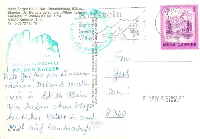 72619699 alte Postkarte Kufstein Tirol Hans Berger Haus Naturfreundehaus Bergsteigerschule Wilder Kaiser postalisch gelaufen Erhaltung siehe scans [FriedD77] KatCode: 11390335070513