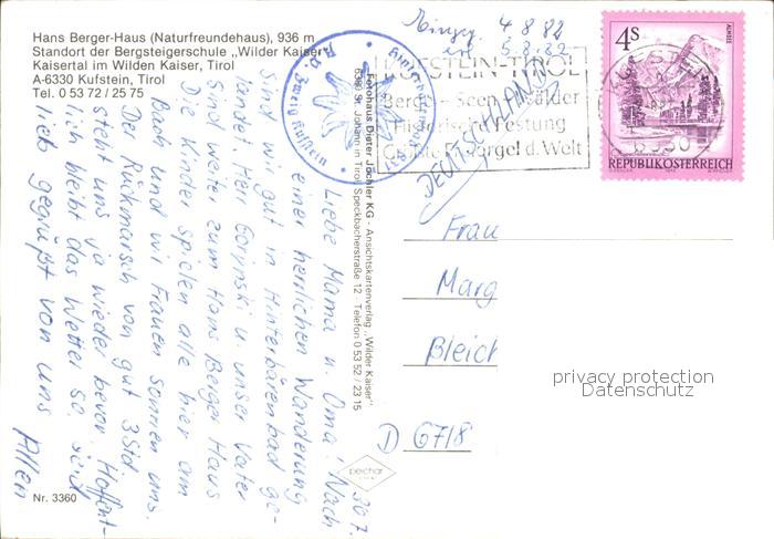 72103620 alte Postkarte Kufstein Tirol Hans Berger Haus Wilder Kaiser postalisch gelaufen KatCode: 11390335070513
