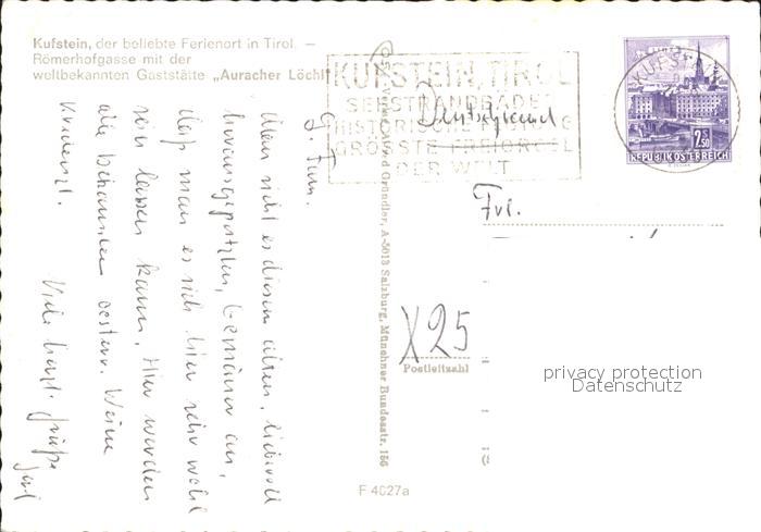 71907379 alte Postkarte Kufstein Tirol Roemerhofgasse Gaststaette Auracher Loechl postalisch gelaufen Erhaltung siehe scans KatCode: 11390335070513