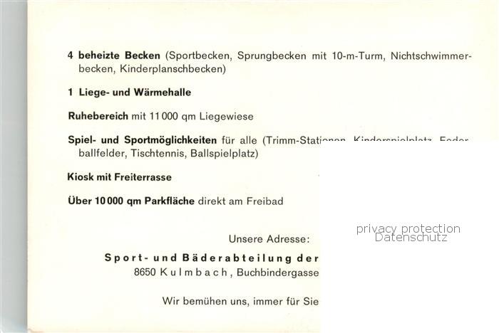 73759170 Kulmbach Bayern Allwetter-Freibad postalisch nicht gelaufen Werbekarte (keine Postkarte) Erhaltung siehe scans [LiesaD40] Werbekarte (keine Postkarte) Lies Katcode 11110009477128