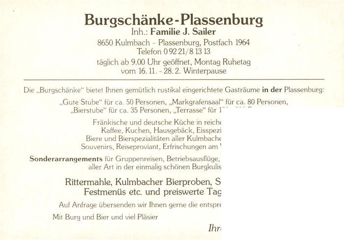 73941805 Kulmbach Bayern Burgschaenke Plassenburg Bierstube Markgrafen-Saal Gute Stube postalisch nicht gelaufen Werbekarte (keine Postkarte) Erhaltung siehe scans [FriedD77] Werbekarte (keine Postkarte) Frie Katcode 11110009477128