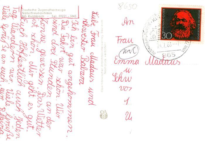 73892981 Kulmbach Bayern Deutsche Jugendherberge Naturfreundehaus postalisch gelaufen Erhaltung siehe scans [WerneD78] alte Postkarte Wern Katcode 11110009477128