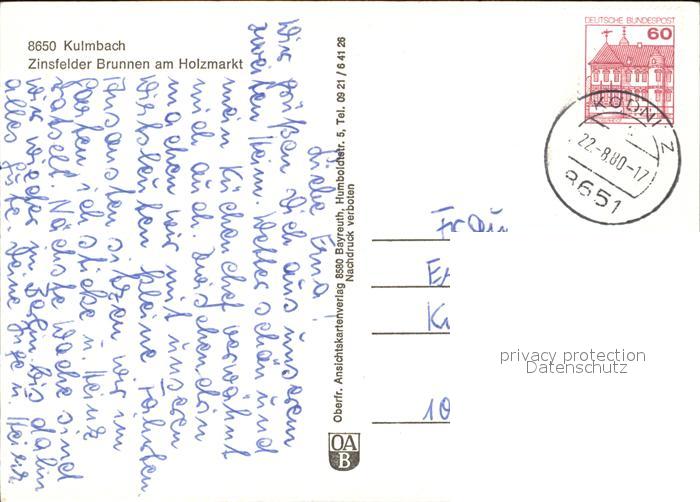 72597333 alte Postkarte Kulmbach Bayern Zinsfelder Brunnen am Holzmarkt postalisch gelaufen Erhaltung siehe scans [FriedD77] KatCode: 11110009477128