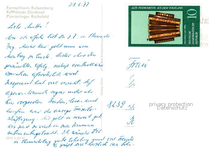 73015418 alte Postkarte Kulpenberg Fernsehturm Kyffhaeuser Denkmal Pionierlager Rathsfeld postalisch gelaufen Erhaltung siehe scans [WerneD78] KatCode: 11110016065003