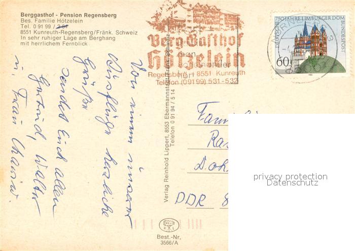 73737183 alte Postkarte Kunreuth Oberfranken Berggasthof Pension Regensberg postalisch gelaufen Erhaltung siehe scans [FriedD77] KatCode: 11110009474145