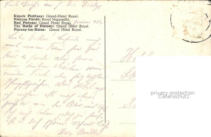 alte Postkarte Kupele Piestany Grand Hotel Royal postalisch gelaufen Erhaltung siehe scans
