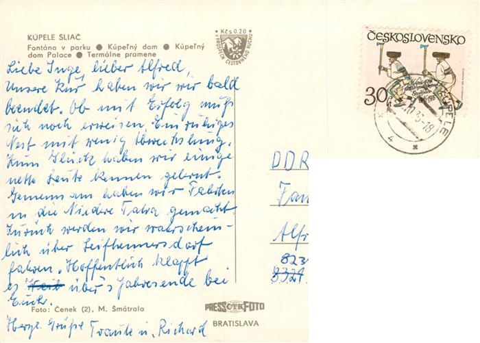 old postcard Kupele Sliac Szliacs Slovakia Fontana v parku Kupelny dom Kupelny dom Palace Termalne pramene postalisch gelaufen Erhaltung siehe scans [FriedD77]