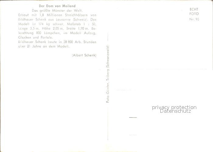Kuriosum Dom von Mailand 18 Millionen Streichhoelzer Bildhauer Schenk postalisch nicht gelaufen Erhaltung siehe scans
