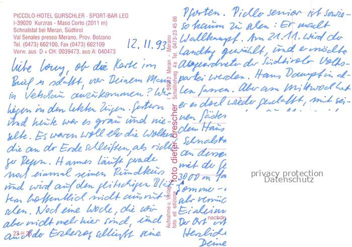 74044023 Kurzras Schnalstal Suedtirol IT Piccolo Hotel Gurschler Sport Bar Leo Kirche postalisch nicht gelaufen Erhaltung siehe scans [WerneD78] KatCode: 11240