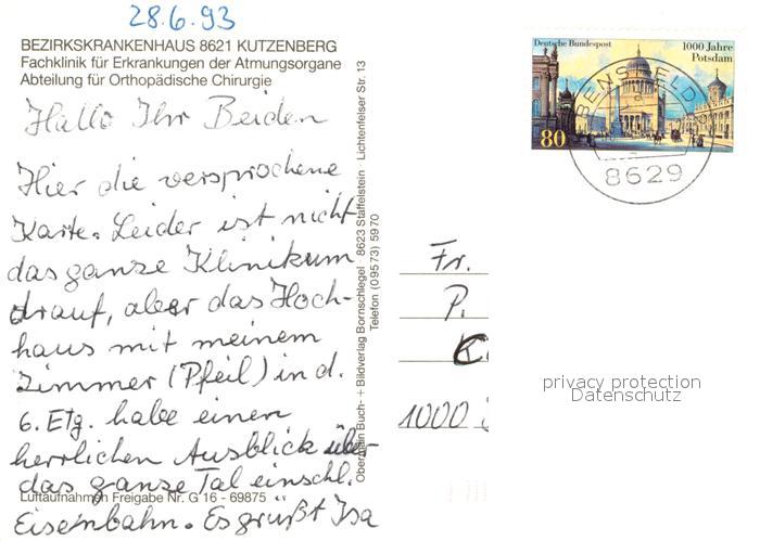 73208792 alte Postkarte Kutzenberg Bezirksklinikum Fliegeraufnahme postalisch gelaufen Erhaltung siehe scans [FriedD77] KatCode: 11110009478120