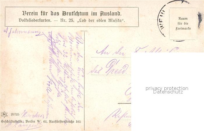 33577028 Kutzer E. Lob der edlen Musika Volksliederkarte Nr. 25 Deutschtum im Ausland postalisch gelaufen Erhaltung siehe scans [PaolaD17] alte Postkarte Paol Katcode 22240000003200