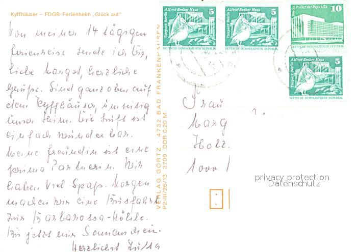 73031873 alte Postkarte Kyffhaeuser FDGB Ferienheim Glueck auf postalisch gelaufen Erhaltung siehe scans [KathaD81] KatCode: 11110016065003