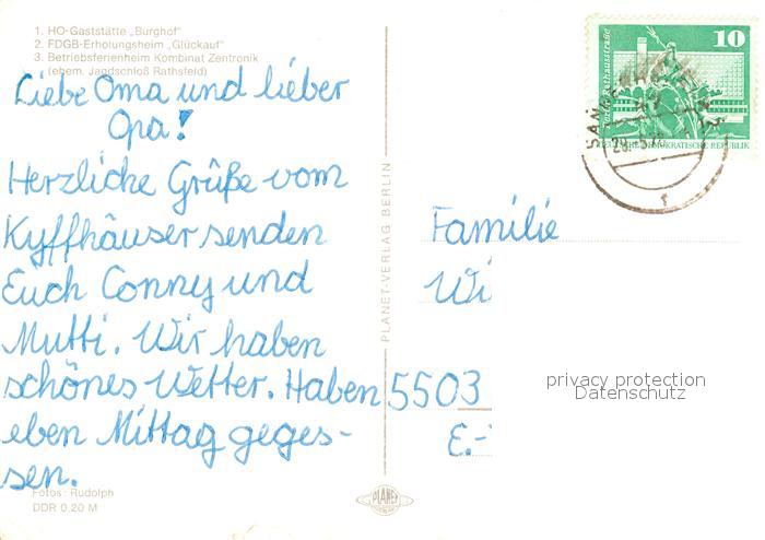 73295257 alte Postkarte Kyffhaeuser HOG Burghof FDGB Erholungsheim Glueckauf Jagdschloss Rathsteich postalisch gelaufen Erhaltung siehe scans [WerneD78] KatCode: 11110016065003