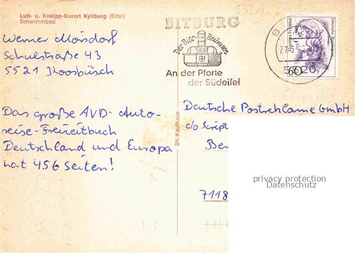 74055159 alte Postkarte Kyllburg Eifelkreis Rheinland-Pfalz Schwimmbad postalisch gelaufen Fliegeraufnahme Erhaltung siehe scans [WerneD78] KatCode: 11110007232070