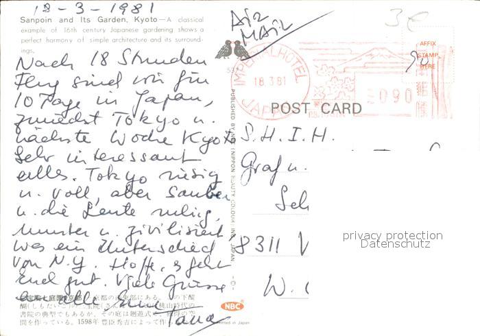 alte Postkarte Kyoto Sanpoin Its Garden postalisch gelaufen Erhaltung siehe scans