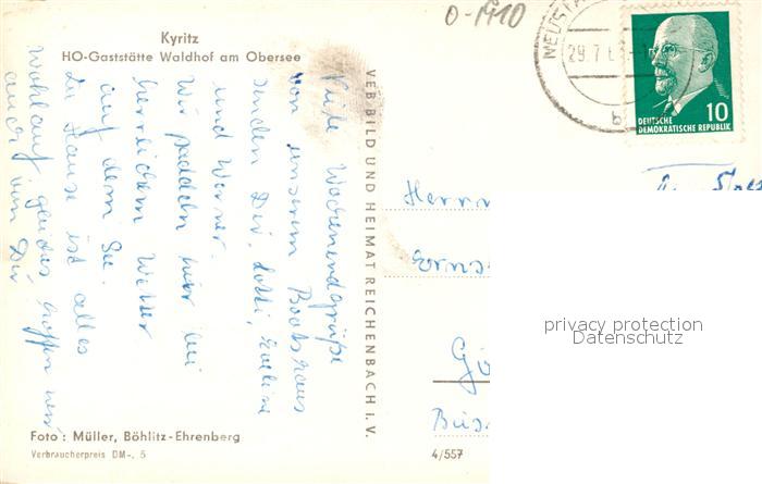43369412 alte Postkarte Kyritz Brandenburg HO Gaststaette Waldhof am Obersee postalisch gelaufen Erhaltung siehe scans [FriedD77] KatCode: 11110012068264