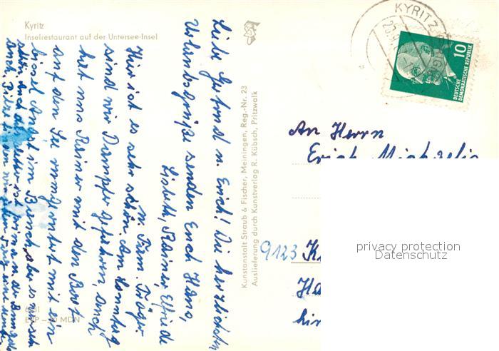 73085463 alte Postkarte Kyritz Brandenburg Inselrestaurant Untersee-Insel postalisch gelaufen Erhaltung siehe scans [NatalD47] KatCode: 11110012068264
