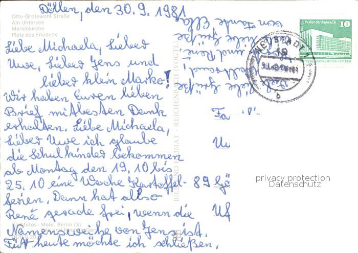 72458071 alte Postkarte Kyritz Brandenburg Otto Grotewohl Strasse Untersee Marienkirche Platz des Friedens postalisch gelaufen Erhaltung siehe scans KatCode: 11110012068264
