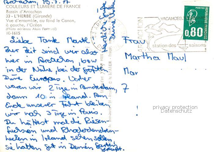 13861589 L Herbe Lege-Cap-Ferret 33 Gironde Vue d ensemble au fond le Canon et l Océan vue aérienne postalisch gelaufen Fliegeraufnahme Erhaltung siehe scans [FriedD77] Fliegeraufnahme carte postale Frie Katcode 11170033633236