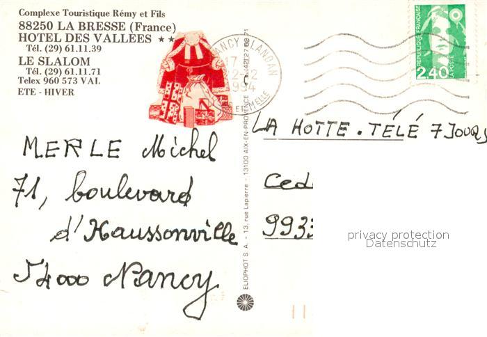13218148 carte postale La Bresse Hotel des Vallees Telesiege postalisch gelaufen Erhaltung siehe scans [LiesaD40] KatCode: 11170088188075