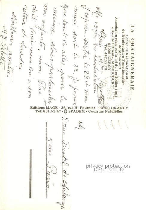 13326400 La Chataigneraie Centre de Reeducation et de Readaptation Fonctionnelles e Menucourt postalisch nicht gelaufen Erhaltung siehe scans [WerneD78] KatCode: 11170085185059