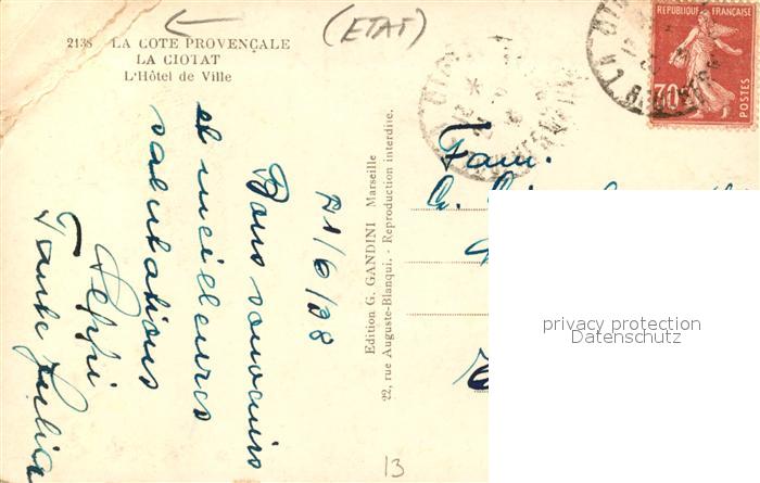 13555361 carte postale La Ciotat Hôtel de Ville Rathaus postalisch gelaufen Erhaltung siehe scans [FriedD77] KatCode: 11170013313028
