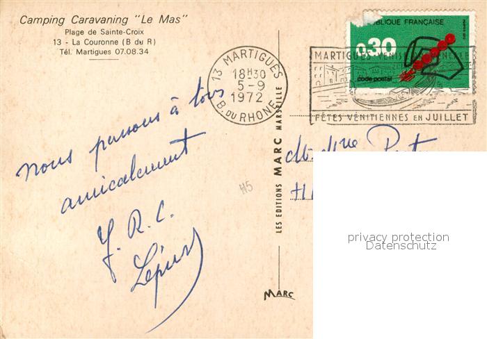 13581416 carte postale La Couronne Martigues Camping Caravaning Le Mas Plage de Sainte Croix postalisch gelaufen Erhaltung siehe scans [WerneD78] KatCode: 11170013413056