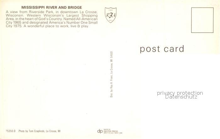 72938573 La Crosse Wisconsin Mississippi River Bridge Riverside Park postalisch nicht gelaufen Erhaltung siehe scans [PaolaD17] KatCode: 14140520000000