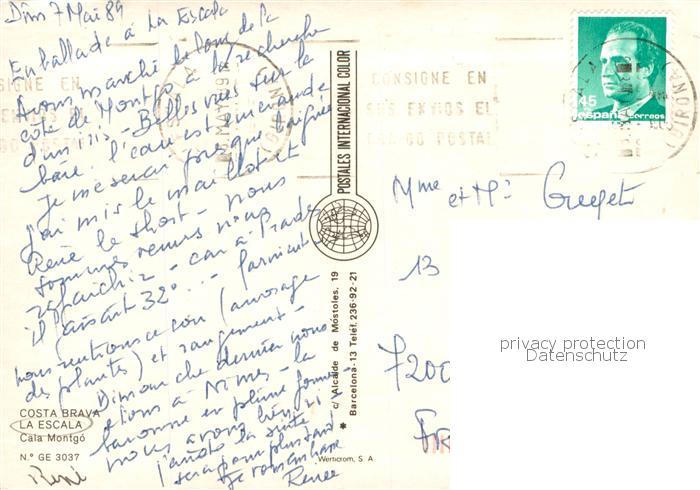 old postcard La Escala Costa Brava ES Cala Montgó Playa Strand postalisch gelaufen Erhaltung siehe scans [FriedD77]
