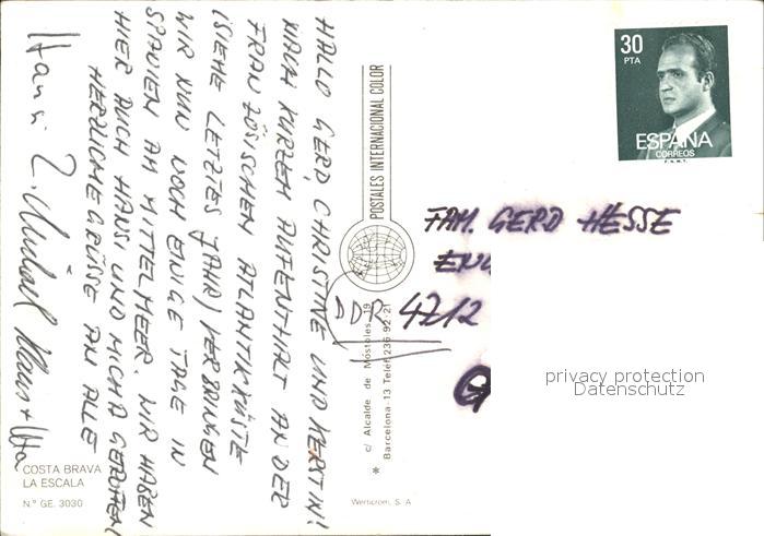 old postcard La Escala Costa Brava Strand postalisch gelaufen Erhaltung siehe scans