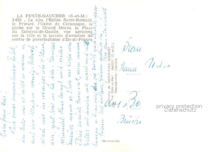13745030 La Ferte-Gaucher Le silo l’Eglise Saint Romain le Prieure l’Usine de Ceramique la peche sur le Grand Morin la Place du General de Gaulle vue aerienne postalisch nicht gelaufen Erhaltung siehe scans [WerneD78] Wern Katcode 11170077377182